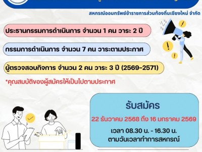 | สหกรณ์เปิดรับสมัครเจ้าหน้าที่บัญชี จำนวน 1 อัตรา | 12 พ.ค. 55 | 506 ครั้ง |